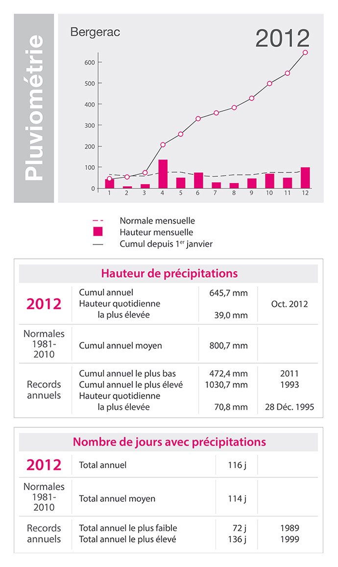 Si le cumul annuel moyen des précipitations est de 800 mm pour la période allant de 1981 à 2010 (à Bergerac), on peut toutefois noter des écarts significatifs au cours des dix dernières années : 732,6 mm en 2004, 576,4 mm en 2005, 859 mm en 2006, 779,4 mm en 2007, 843,6 mm en 2008, 798,2 mm en 2009, 679,6 mm en 2010, 472,4 mm en 2011, et 645,7 mm en 2012.