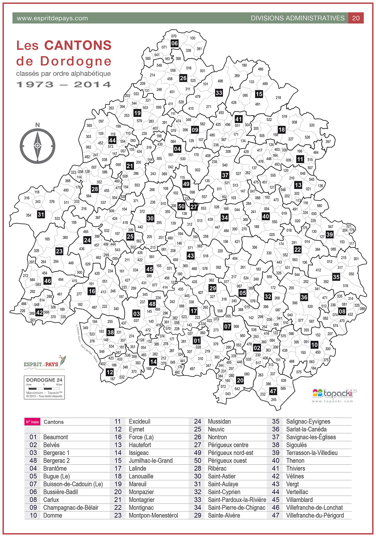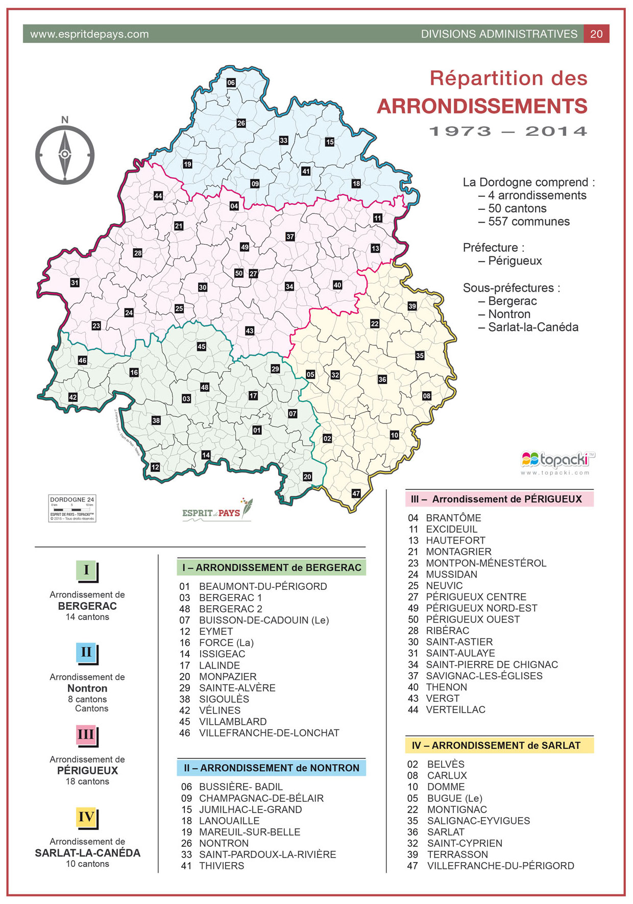 Le département de la Dordogne comprend aujourd’hui 4 arrondissements, 25 cantons, et 520 communes depuis le 1er janvier 2017. Sa préfecture est Périgueux et ses chefs-lieux d’arrondissements sont Bergerac, Nontron et Sarlat. Lors du découpage des départements en arrondissements, cantons et communes – qui fut instauré le 17 février 1800 – on dénombrait 50 cantons et 557 communes.