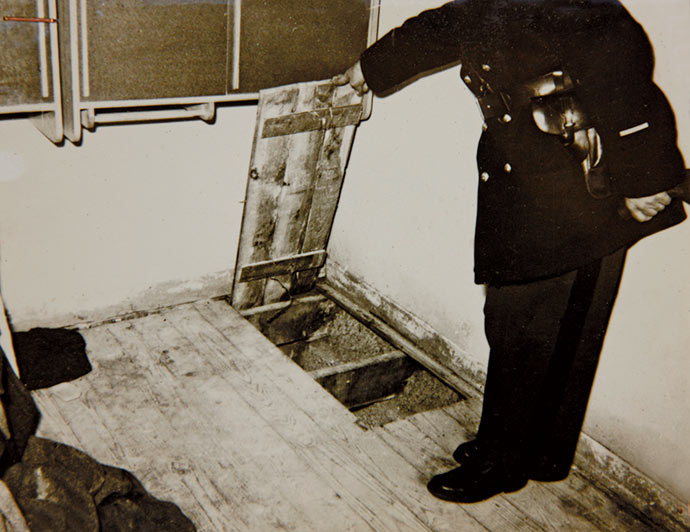 Gendarme montrant la trappe par laquelle se sont évadés les 39 détenus, politiques algériens, source ADD 1141 W 239.