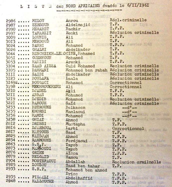 Liste des évadés algériens du 6 novembre 1961. « T.F. » (Travaux forcés) et « T.F.P. », (Travaux forcés à perpétuité). Source ADD 1141 W 239.