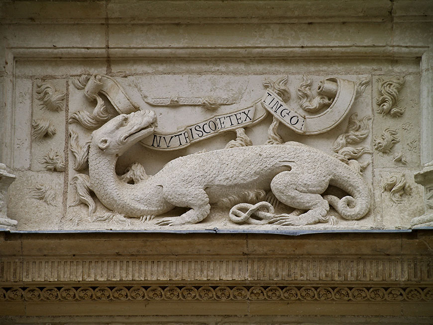 • La salamandre, emblème du roi François Ier, avec sa devise : « Nutrisco et extinguo » (« Je nourris et j’éteins ») – Château d’Azay-le-Rideau, Indre-et-Loire, France., By Myrabella (Own work), via Wikimedia Commons.