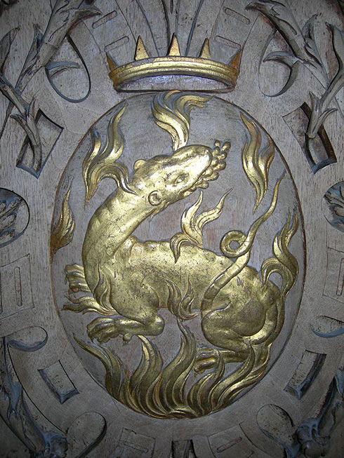 • Salamandre : gros plan d’un médaillon de la galerie François Ier, au château de Fontainebleau, By Alain Dutrevis (Own work), via Wikimedia Commons.