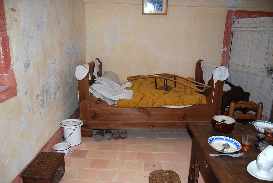 Attenant à la cuisine, il y a une chambre. Un lit à quatre quenouilles, avec rideaux et « dossier de toile d’étoupe » et courte-pointe (7) de laine, fait face à un autre lit « à tombeau (8)», plus petit, qui possède paillasse, drap et couverture de laine, couette remplie de plume. Une table à quatre pieds, un coffre, qui ne renferme qu’une « turne (?) à l’huile », et trois chaises complètent l’ameublement.
