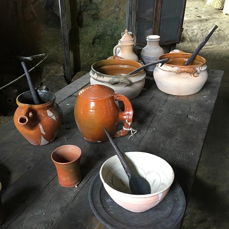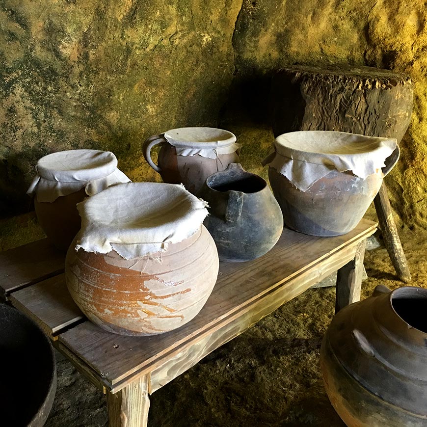 La cave comporte cuve et barriques, dont deux pleines de piquette. Au « fournil », rien ne manque, ni « grials » pour faire le pain, ni pelle pour le mettre au four.